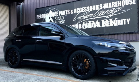 N様のハリヤーのご紹介!M'sスピードのフルエアロにカールソンのホイール!テインの車高調!マフラーもM'sスピードの左右4本出し!ブラックのボディにシックスセンスレッドゴールドのブレーキキャリパーカバーが誇らしげです^_^♪♪